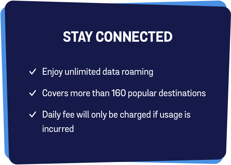 - Ultimate Peace of Mind - Instantly enjoy unlimited data roaming and global travel insurance coverage when you use Data Roaming Day Plan Plus overseas